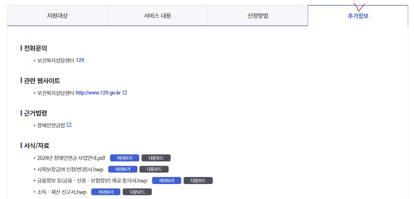 '복지서비스 상세(중앙) – 추가정보'에서 관련 서류 다운로드가 가능합니다. 세부 내용은 아래를 참고하시기 바랍니다.
